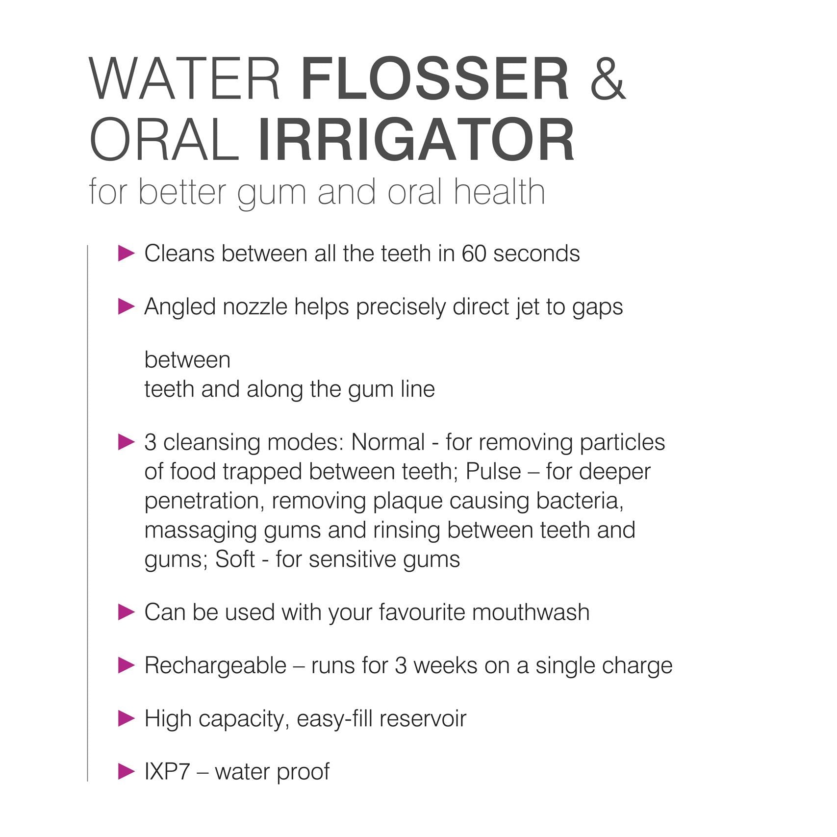 3 cleansing modes: Normal - for removing particles of food trapped between teeth; Pulse – for deeper penetration, removing plaque causing bacteria, massaging gums and rinsing between teeth and gums; Soft - for sensitive gums